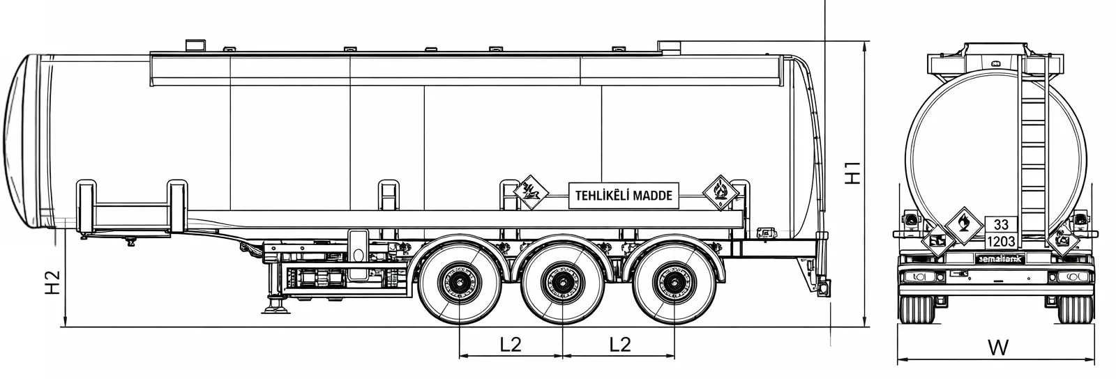 - Akslar SAF Holland, BPW ve Sertel gibi lider üreticilerden temin edilen 3 x 9 ton akslar, EN 13094:2008 ve ADR gerekliliklerine uygun güvenli taşıma sağlar.